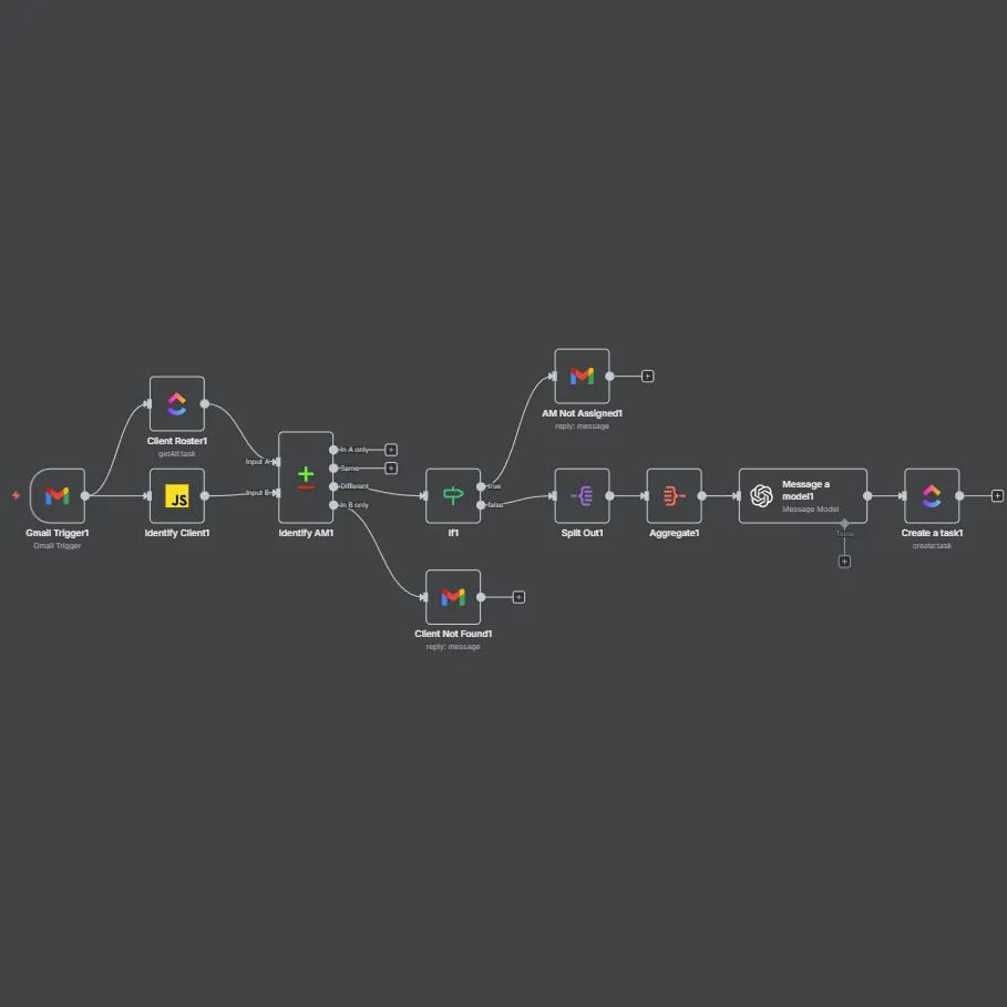 An automation that turns forwarded client emails into structured tasks by identifying the client, assigning the right AM, extracting task details with an LLM, and handling edge cases automatically.