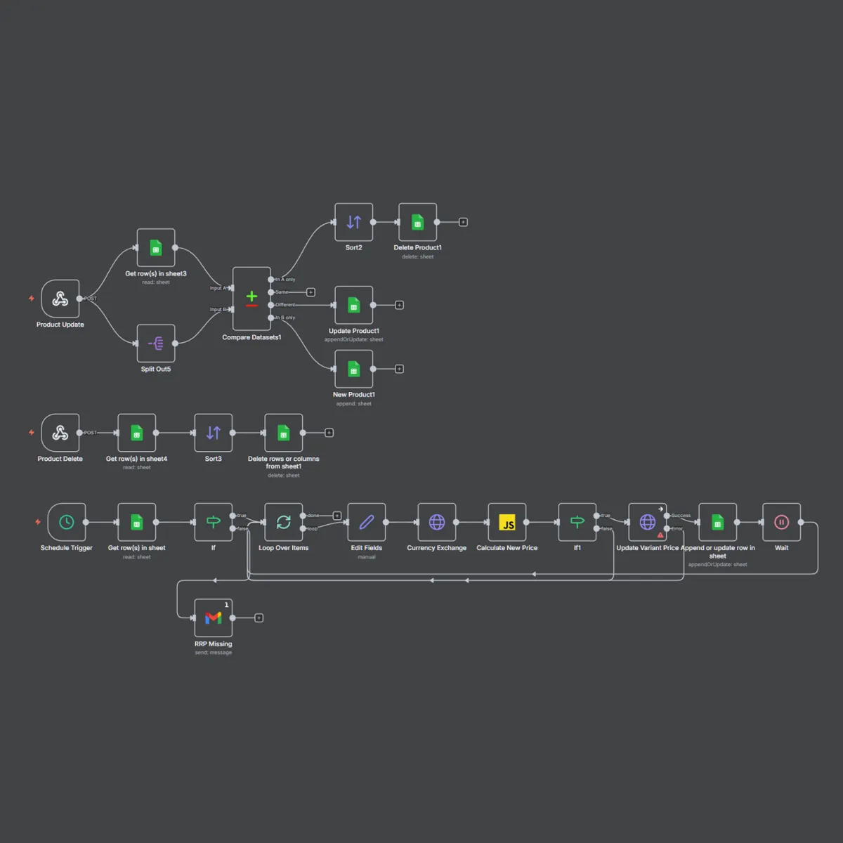 This workflow recalculates product pricing using the latest exchange rates, updates Shopify variants automatically, and keeps a synced Google Sheet as the source of truth. It also flags missing RRPs or currency codes to prevent incorrect pricing.