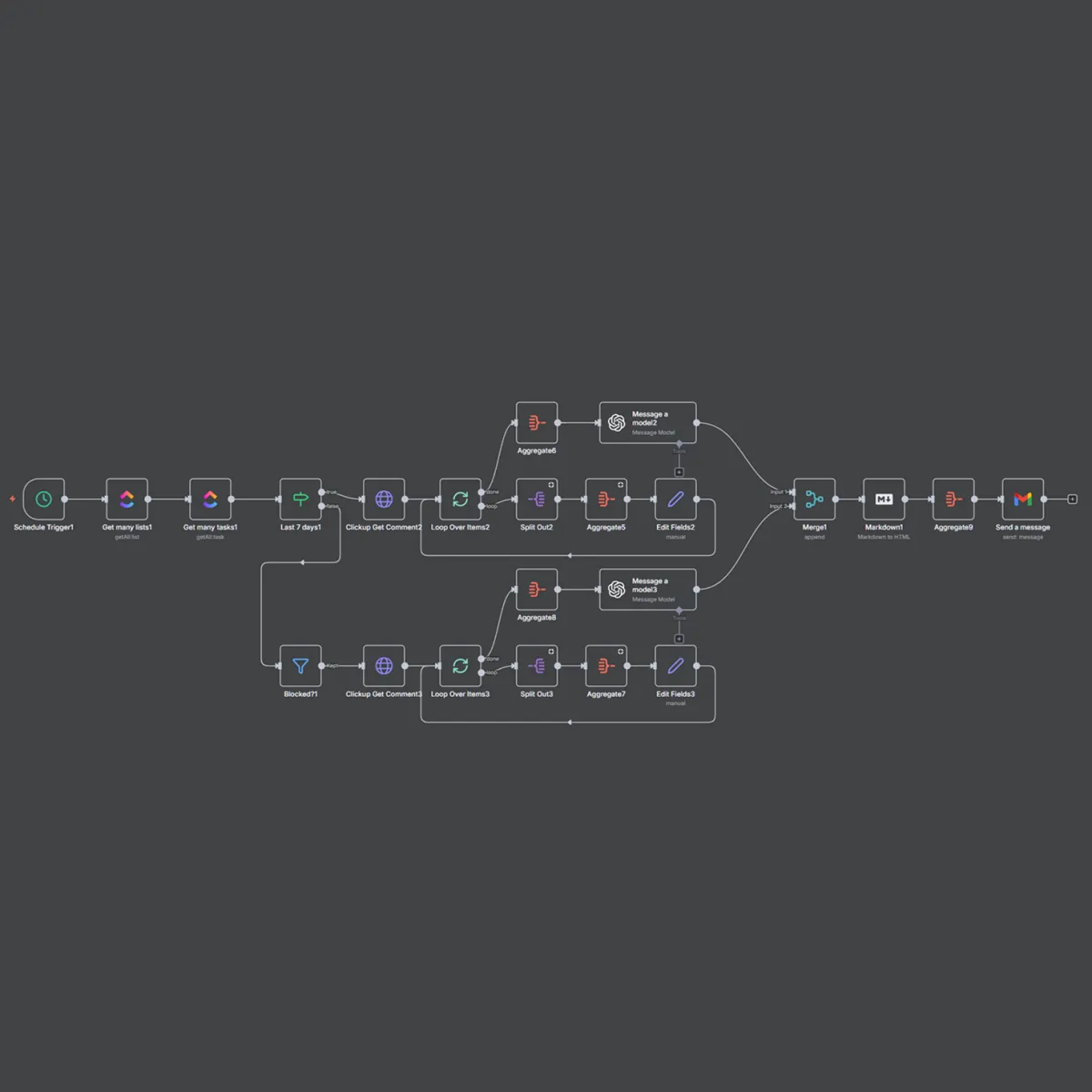 It pulls all tasks from the past week, analyzes progress, highlights risks, and surfaces blockers that need attention. It then compiles everything into a clean weekly digest with summaries and recommended actions.